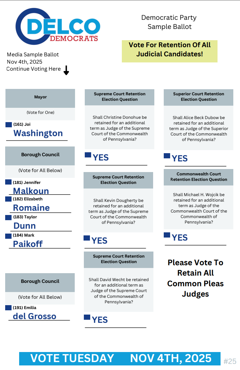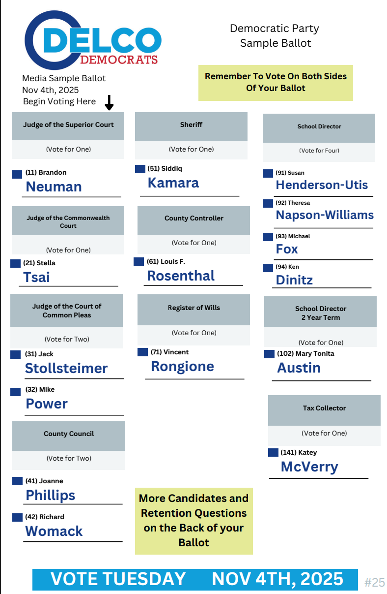 Delaware County, PA: The General Election season is upon us! Use this post for your sample ballot as you vote in person or by mail for the November 4th Elections.